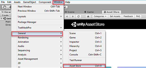 3. Go to Window --> General --> Asset Store (if you can't find the Aseets Store in top menu, try to use Ctrl+9 button for Windows or Fn9 for Mac.