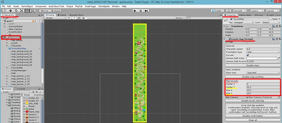 6 - To expand MAP BOUNDS. Go to Hierarchy --> Choose "Levels Map" --> Go to Inspector --> Level Map (Script) --> Change "Map bounds" parameters (Size Y and Center Y) until the white frame covers the entire game map.
