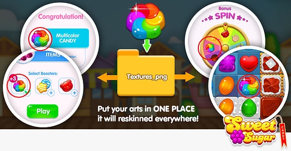 You don’t need to change a lot of similar arts in different places into the project. Just change one art in Textures_png folder, and this art will replaced in all places of the project, where it should be located.