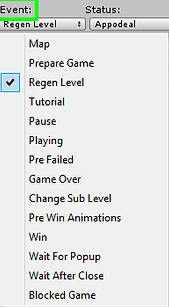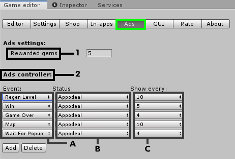 Ads controller - includes three parameters: a - Event - the moment after which the advertisement is shown b - Status - type of advertising (now is just Appodeal) c - Show ads every time - after the specified number of events