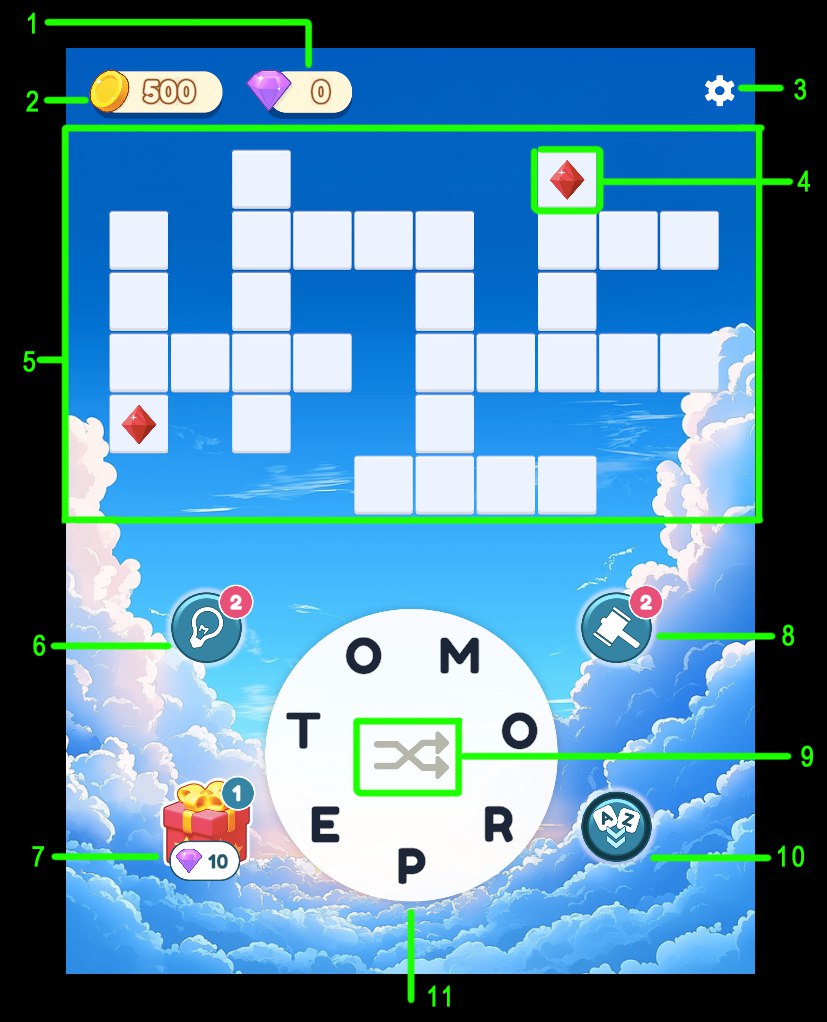 <table data-header-hidden><thead><tr><th width="93">Number</th><th width="249">UI Element</th><th width="387">Description</th></tr></thead><tbody><tr><td>1</td><td>Gems</td><td>Premium Gems currency</td></tr><tr><td>2</td><td>Coins</td><td>Coins currency</td></tr><tr><td>3</td><td>Settings Button</td><td>Opens the game’s settings or pause menu</td></tr><tr><td>4</td><td>Red Gem pickup</td><td>A collectible red gem on the puzzle board. </td></tr><tr><td>5</td><td>Crossword Puzzle Board</td><td>Main game area where players complete the word puzzle by forming words from available letters.</td></tr><tr><td>6</td><td>Tip Booster Button</td><td>Opens one tile</td></tr><tr><td>7</td><td><a href="settings/gift-settings">Gift Box Button</a></td><td>Grants rewards for collecting red gems</td></tr><tr><td>8</td><td>Hammer Booster Button</td><td>A power-up used to break or reveal a tile. </td></tr><tr><td>9</td><td>Shuffle Button</td><td>Randomizes the arrangement of the letter wheel to help the player spot new words.</td></tr><tr><td>10</td><td>Extra Words Button</td><td>Collecting extra words allow to get Gems</td></tr><tr><td>11</td><td>Letter Wheel</td><td>Core gameplay input area. Players tap or drag letters here to create words and solve the puzzle.</td></tr></tbody></table>