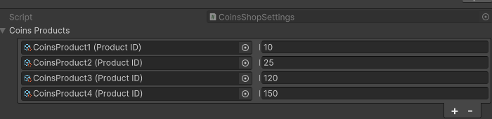 The Coins Shop Settings uses an array to define multiple coin purchase options. Each entry in the array represents a distinct product with its own Product ID and coin value.