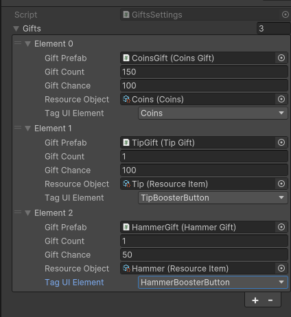The GiftSettings script defines a configurable set of potential gifts that a player can receive, such as coins, tips, or power-ups.&#x20;