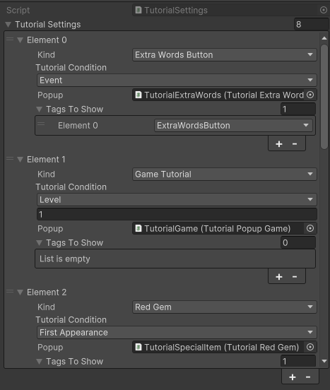 `Tutorial condition:` There are several tutorials can be shown: Level, Event, First appearance\